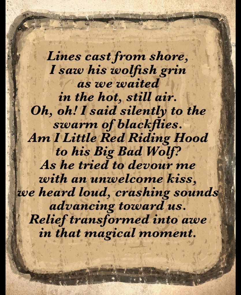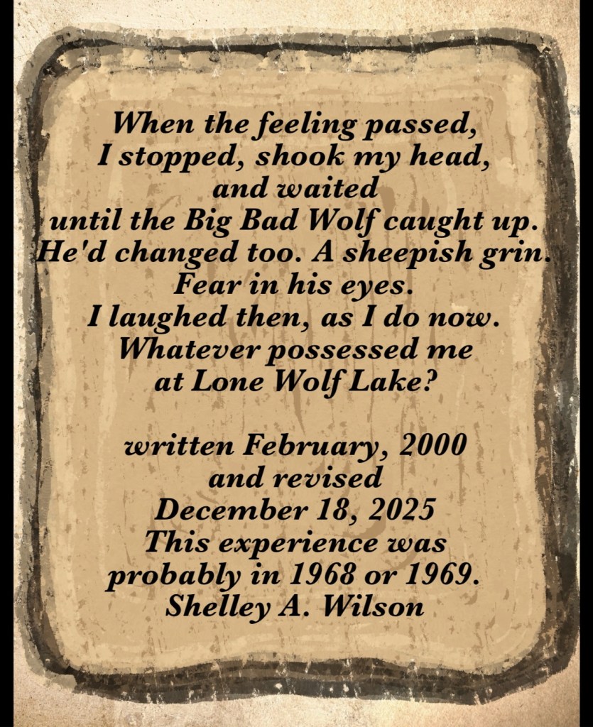 The black and white photo in this collage is probably the timing of this experience. In this pic my younger sister, Bev, and I were visiting our uncle’s place where he kept horses for trail rides in the bush near his farm. His daughter, our cousin, Lori Thicke, has written a book coming out on Indigo shelves this April (by Simon and Schuster publishers) called Dreamer’s Daughter, which will probably include at least one story about that farm as well. Uncle Dacker was quite a colourful character with an interesting life. As for my story here, I never saw the Big Bad Wolf again. No wonder!