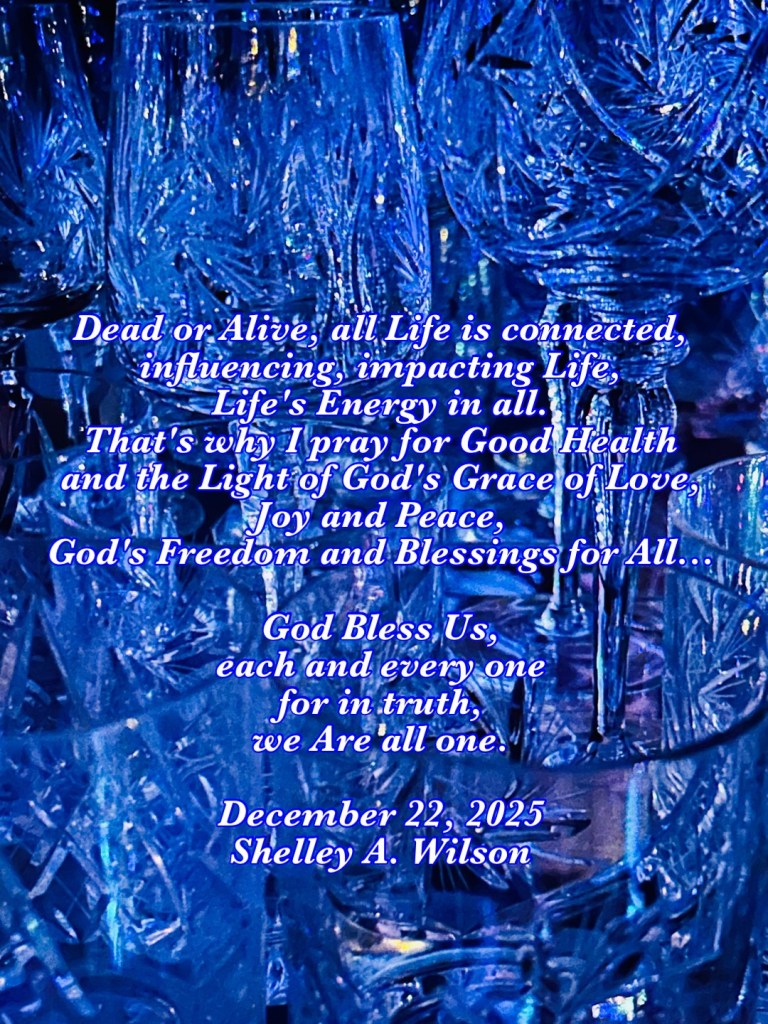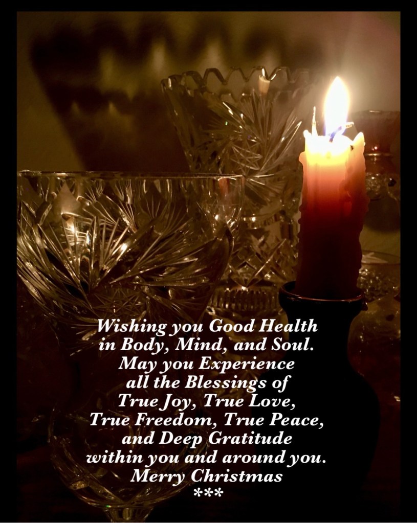 I wish you wellbeing in these dark days and dangerous times. If you celebrate the winter solstice, Happy Solstice, if you celebrate Christmas, Merry Christmas, and if you celebrate other religious Holidays, Happy Holidays. My family, some friends, and I celebrate Christmas in our hearts and enjoy the gift giving of the Santa Story as well. Whatever you celebrate, may Peace prevail.