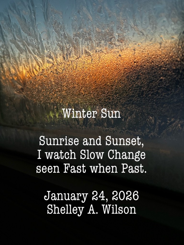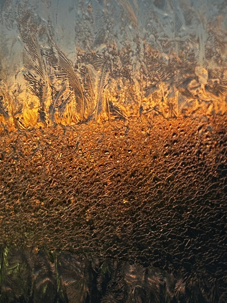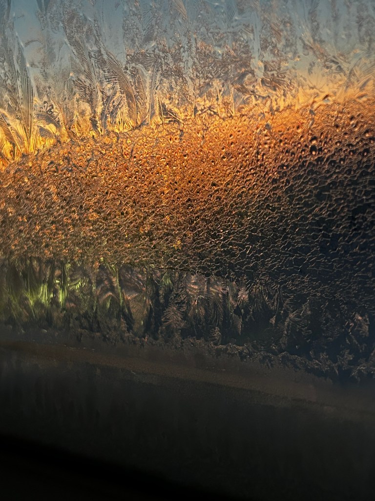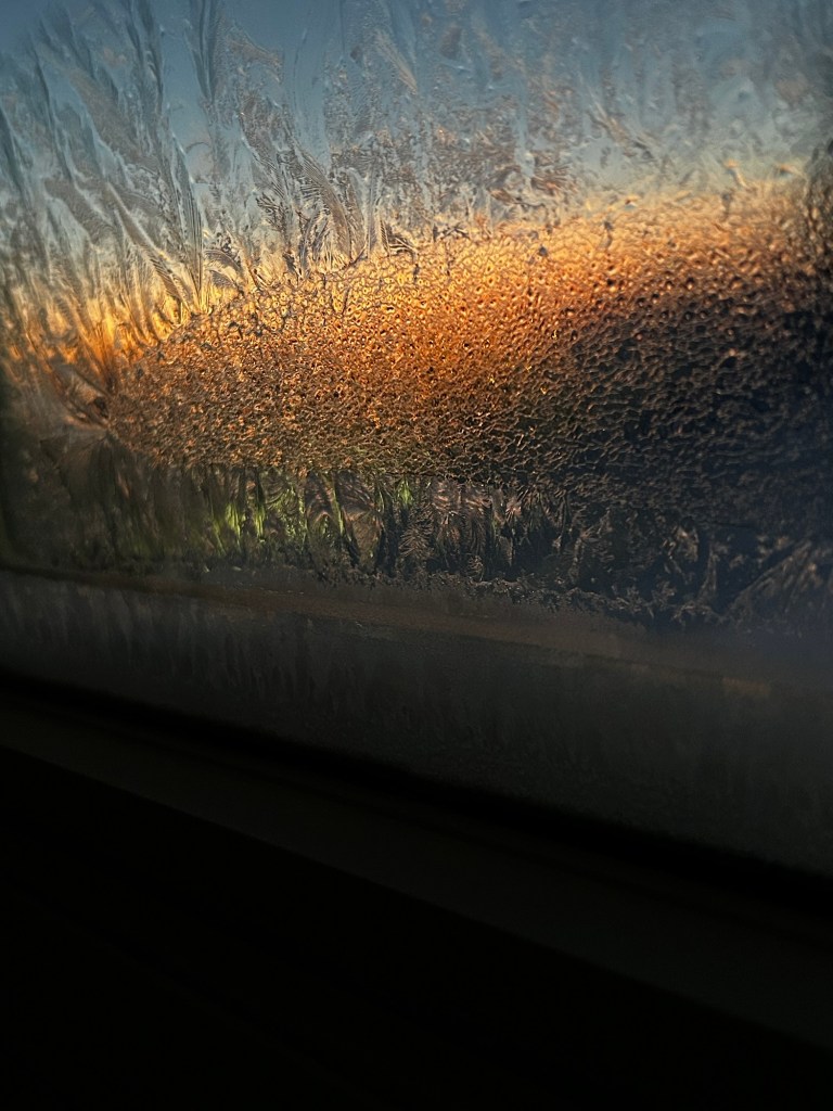 I got down on my knees to capture the early morning sunlight of the Sunrise through a wee bit of frost on a window, still clad in pjs and slippers. The things we do for Beauty! The camera filtered the light through that ‘abstract art’ frost in a few fast captures. Later yesterday, I caught the setting sun as we drove Highway 11 between Temiskaming Shores and Englehart. These Sunset photos would have been better if we had stopped, but I managed to capture this transition of light while moving at highway speed from the passenger side of the car. If I were a professional photographer, I’d have a better than cellphone camera and a tripod and such to capture the fleeting moments. Still, I am thankful for this technology too. I do not take anything for granted.
