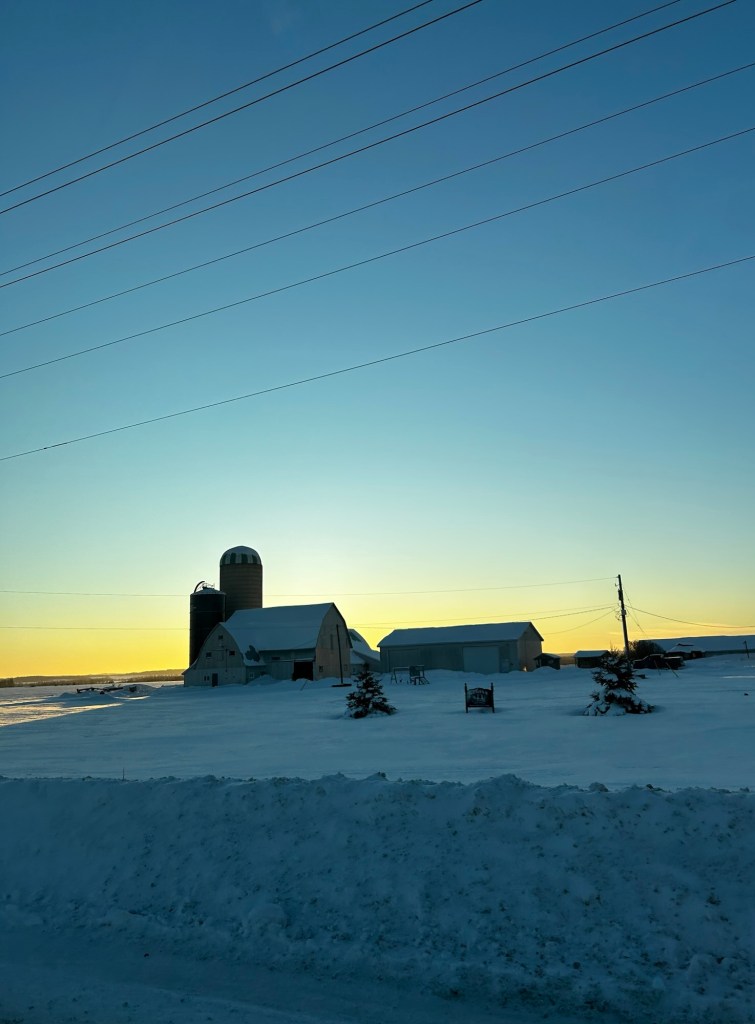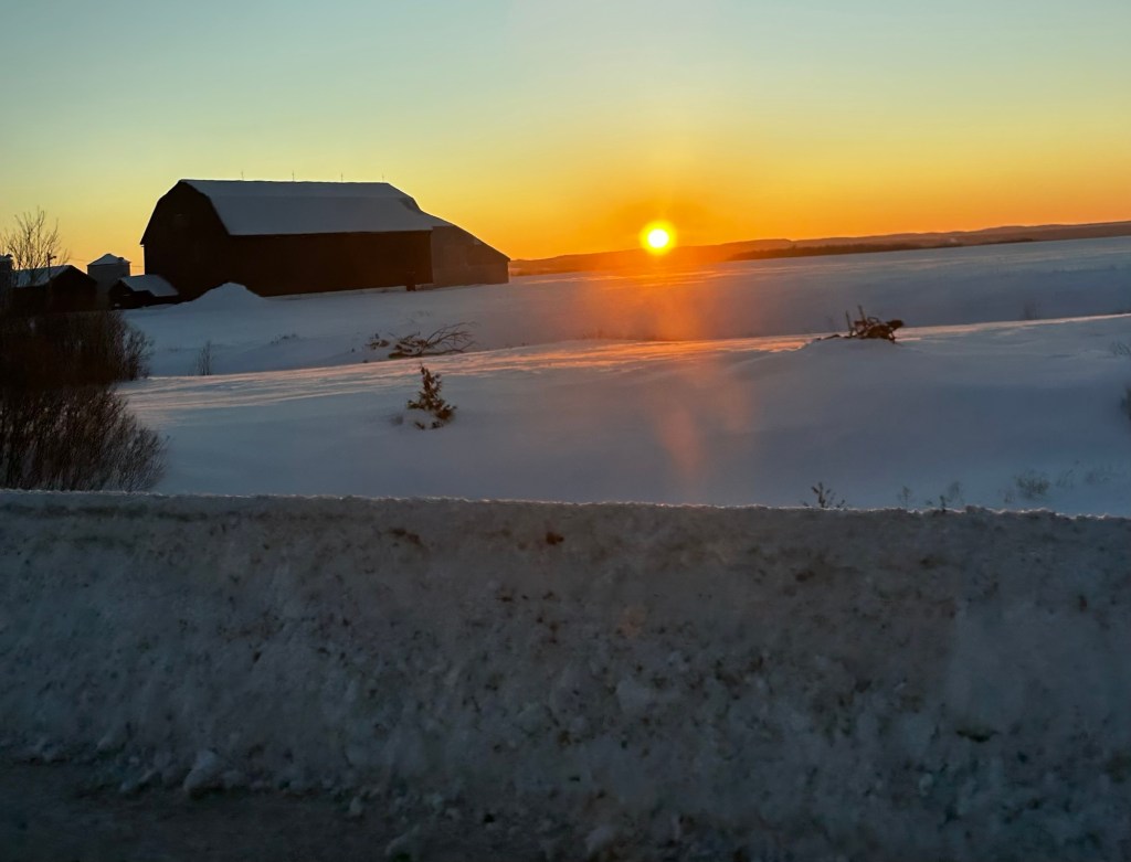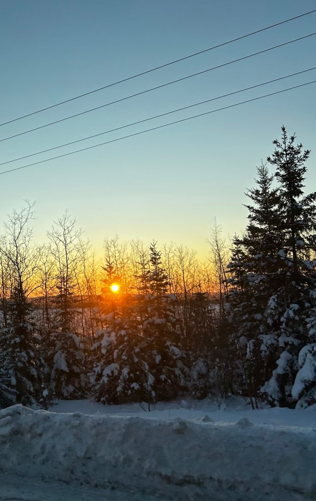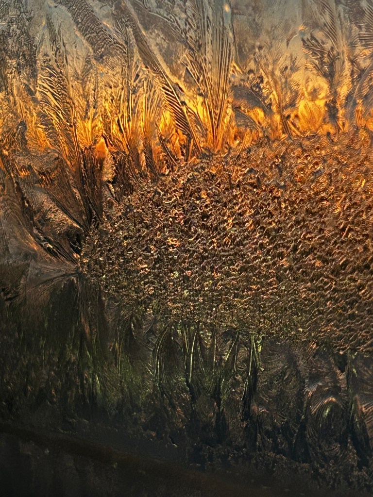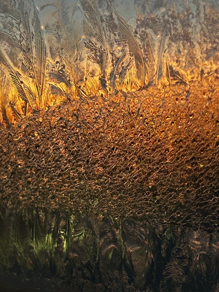 I got down on my knees to capture the early morning sunlight of the Sunrise through a wee bit of frost on a window, still clad in pjs and slippers. The things we do for Beauty! The camera filtered the light through that ‘abstract art’ frost in a few fast captures. Later yesterday, I caught the setting sun as we drove Highway 11 between Temiskaming Shores and Englehart. These Sunset photos would have been better if we had stopped, but I managed to capture this transition of light while moving at highway speed from the passenger side of the car. If I were a professional photographer, I’d have a better than cellphone camera and a tripod and such to capture the fleeting moments. Still, I am thankful for this technology too. I do not take anything for granted.