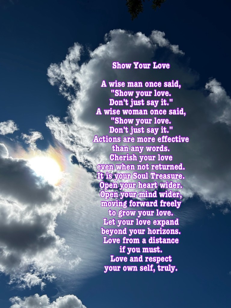 Show Your Love. I’m getting more clarity on this subject these days, so I apologize if this comes across as being ‘preachy poetry’. When I open up to an inspiration, I just let it flow.