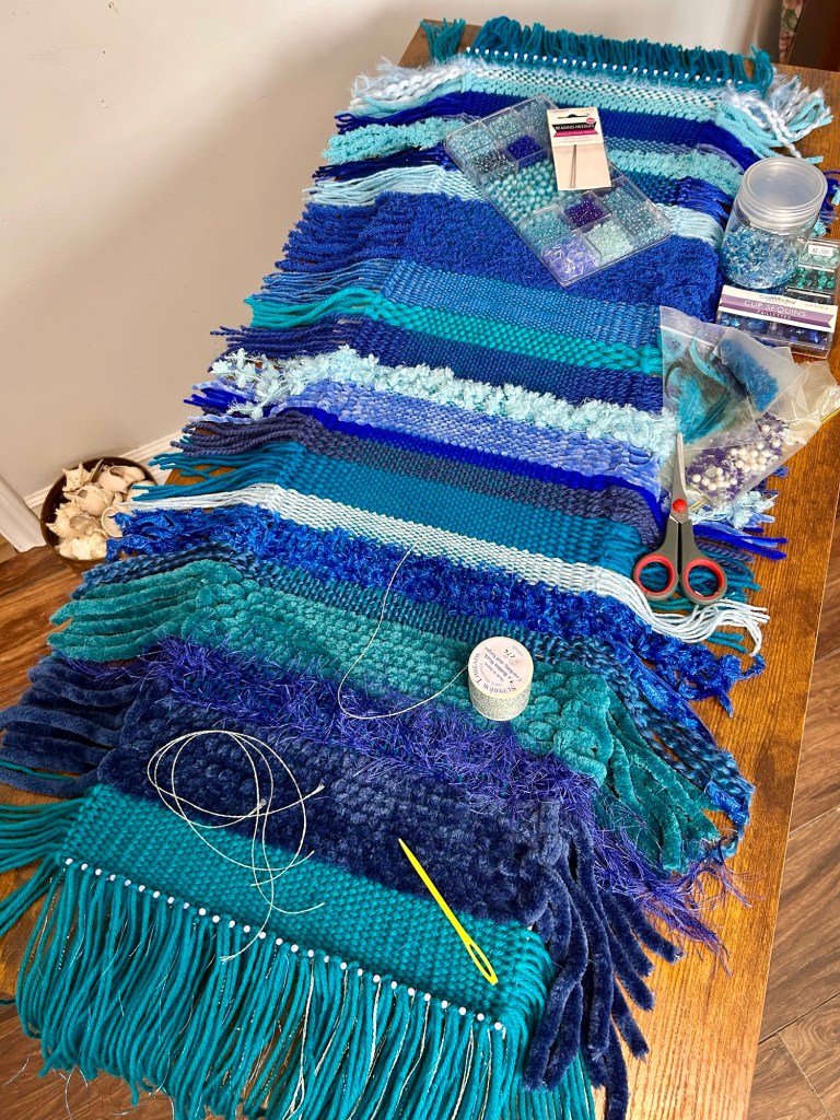 Spontaneous weaving is a way for me to focus on positive creativity these days. This is the first of a colour series I hope to add to my decor. It pleases me to add beads and whatever to the yarns. I’ll post a pic of this hobby project when finished.