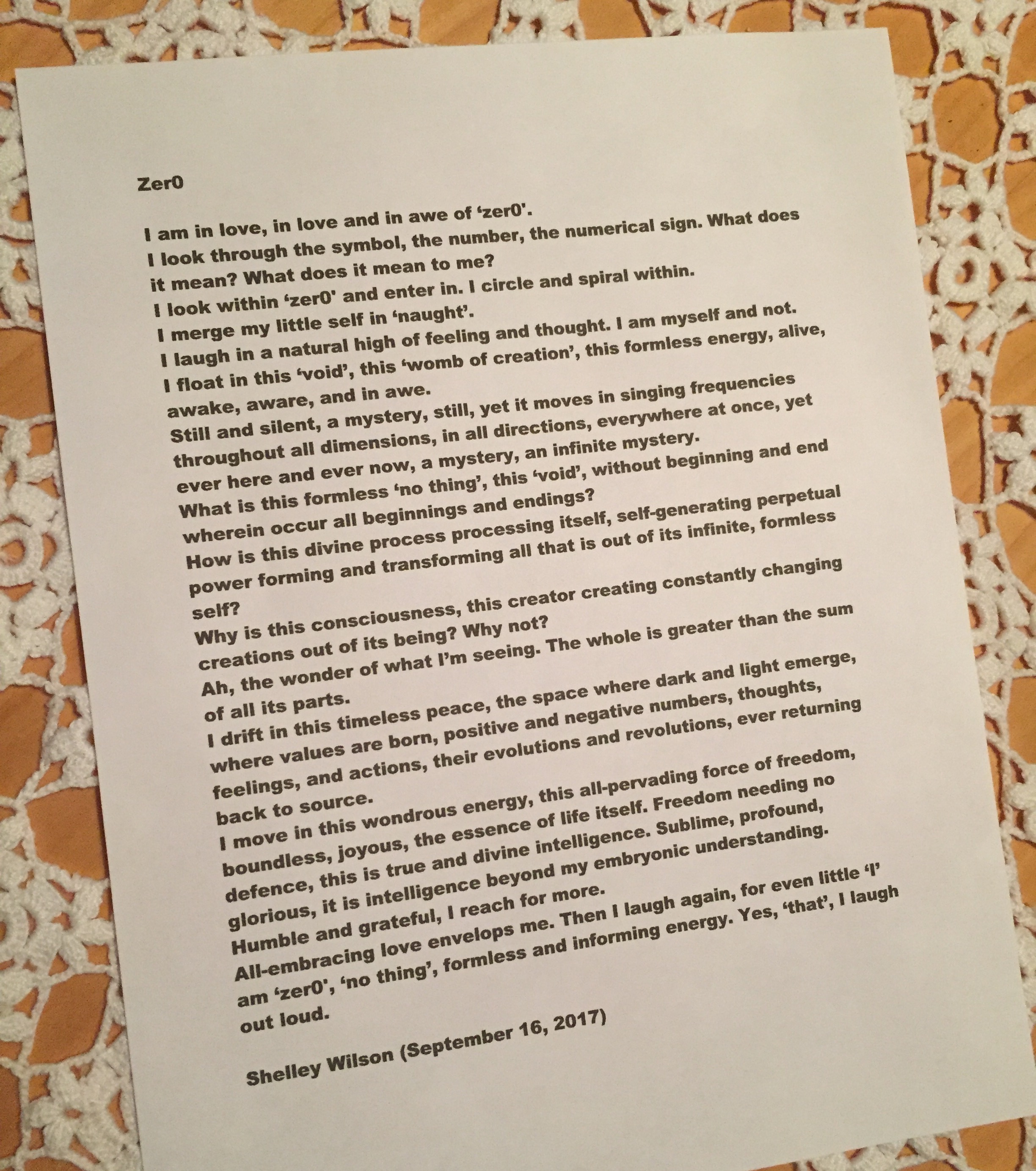All-embracing love envelops me. Then I laugh again, for even little ‘I’ am ‘zer0′, ‘no thing’, formless and informing energy. Yes, ‘that’, I laugh out loud.