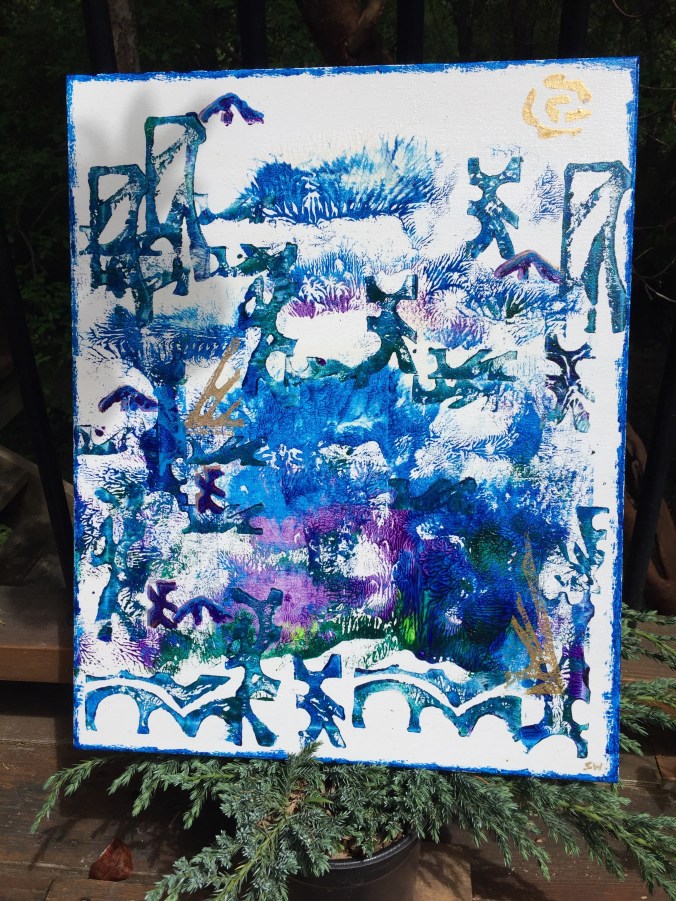 Acrylics and metallic paint on canvas. This is the first in a series I’m working on suitably titled ‘Seeing Things’. An exercise in imagination.