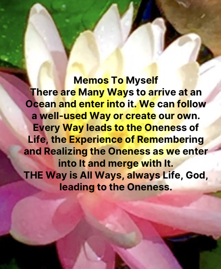There are Many Ways to arrive at an Ocean and enter into it. We can follow a well-used Way or create our own. Every Way leads to the Oneness of Life, the Experience of Remembering and Realizing the Oneness as we enter into It and merge with It. THE Way is All Ways, always Life, God, leading to the Oneness.