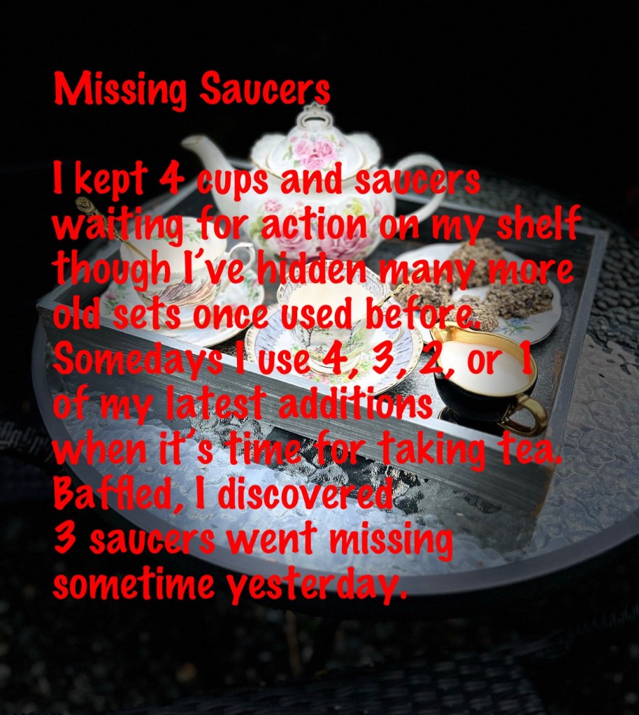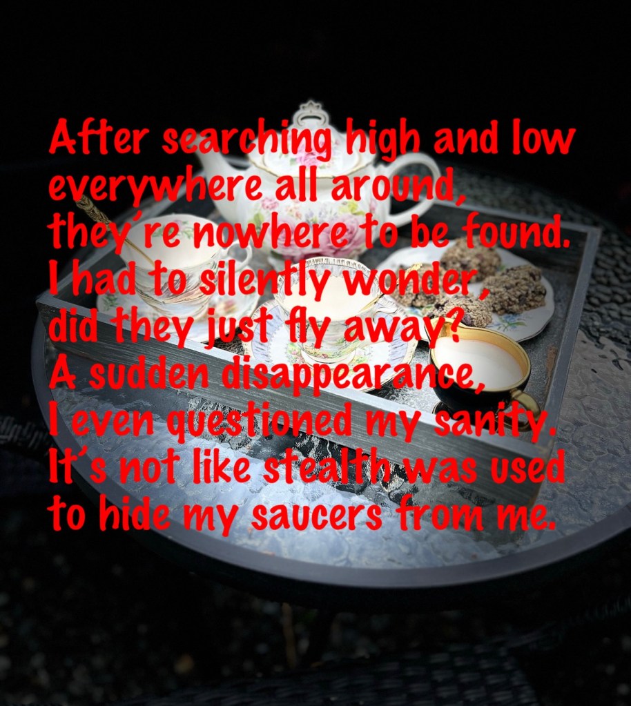 Missing Saucers October 3, 2023 / Flowerpoet Share this: Click to share on Facebook (Opens in new window) Facebook Click to share on Pinterest (Opens in new window) Pinterest Click to share on X (Opens in new window) X Click to email a link to a friend (Opens in new window) Email Click to print (Opens in new window) Print Like Loading... Related