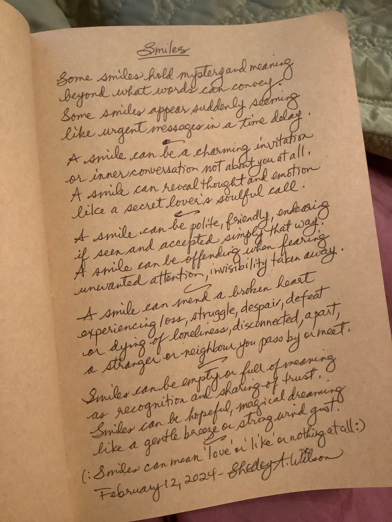 Smiles February 12, 2024 / Flowerpoet / Leave a comment Smiles. My poem and scribble. Share this: Click to share on Facebook (Opens in new window) Facebook Click to share on Pinterest (Opens in new window) Pinterest Click to share on X (Opens in new window) X Click to email a link to a friend (Opens in new window) Email Click to print (Opens in new window) Print Like Loading...