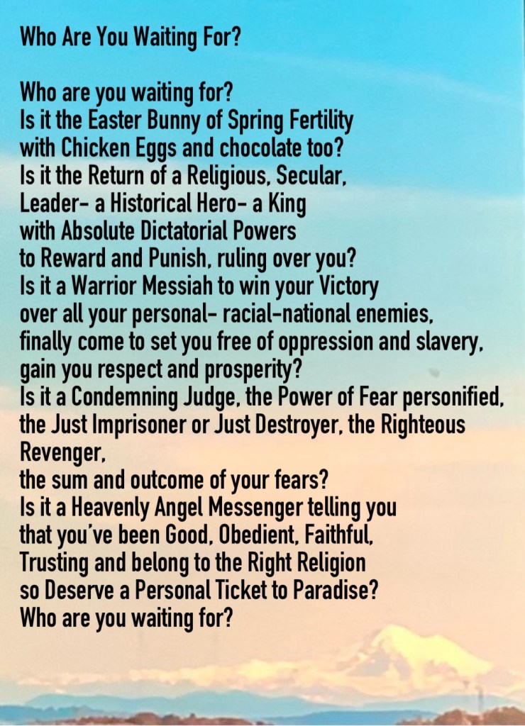 Who Are You Waiting For? March 30, 2024 / Flowerpoet Who are you waiting for? Share this: Click to share on Facebook (Opens in new window) Facebook Click to share on Pinterest (Opens in new window) Pinterest Click to share on X (Opens in new window) X Click to email a link to a friend (Opens in new window) Email Click to print (Opens in new window) Print Like Loading... Related