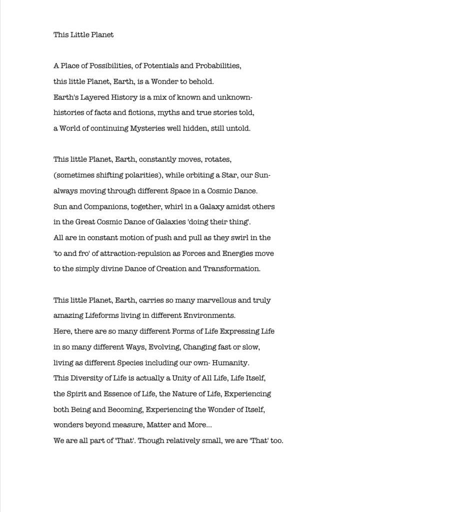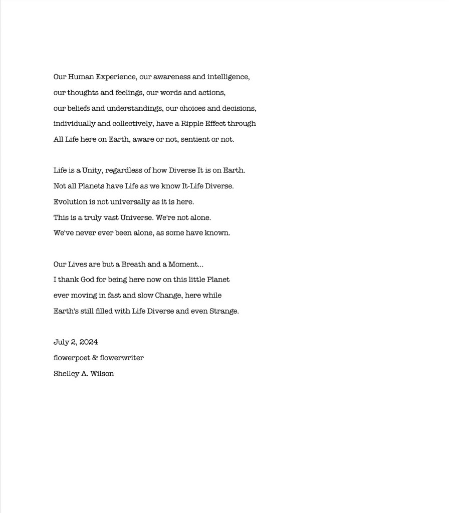 This Little Planet July 2, 2024 / Flowerpoet This little Planet… my poem and photo Share this: Click to share on Facebook (Opens in new window) Facebook Click to share on Pinterest (Opens in new window) Pinterest Click to share on X (Opens in new window) X Click to email a link to a friend (Opens in new window) Email Click to print (Opens in new window) Print Like Loading... Related