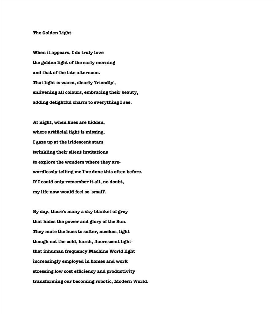 late afternoon light…early morning light…Artists are usually sensitively aware to light, as am I. I am especially fond of early morning and late afternoon golden light. Not wishing to ‘hide my light under a bushel’, I’ve chosen to write this poem to share.