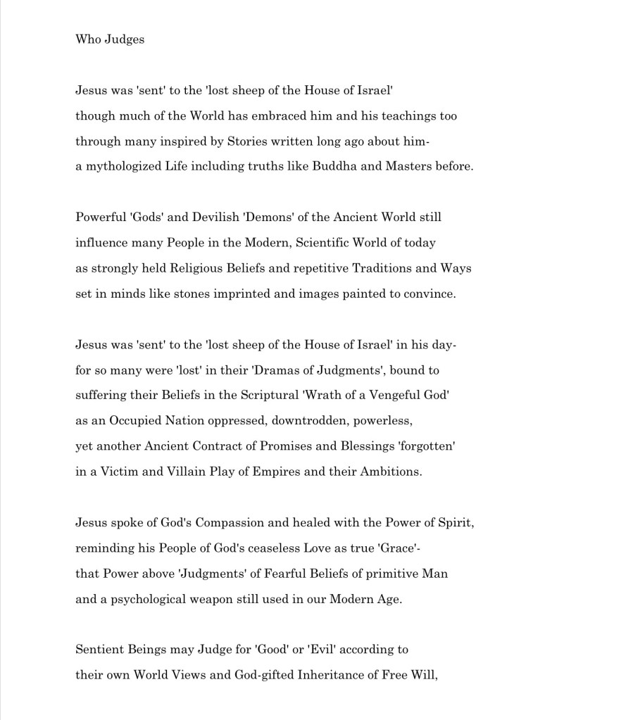 Who Judges November 6, 2024 / Flowerpoet May we evolve and grow in Higher Wisdom Share this: Click to share on Facebook (Opens in new window) Facebook Click to share on Pinterest (Opens in new window) Pinterest Click to share on X (Opens in new window) X Click to email a link to a friend (Opens in new window) Email Click to print (Opens in new window) Print Like Loading... Related