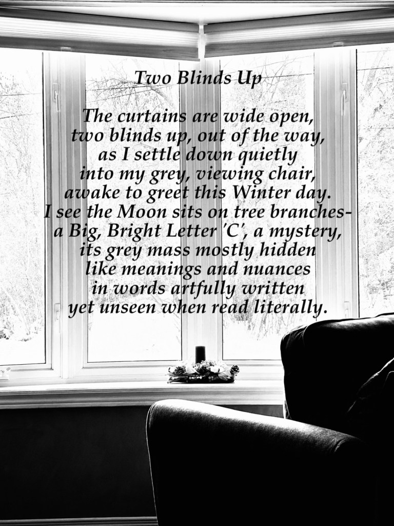 Two Blinds Up January 25, 2025 / Flowerpoet / Leave a comment Two Blinds Up… Share this: Click to share on Facebook (Opens in new window) Facebook Click to share on Pinterest (Opens in new window) Pinterest Click to share on X (Opens in new window) X Click to email a link to a friend (Opens in new window) Email Click to print (Opens in new window) Print Like Loading...