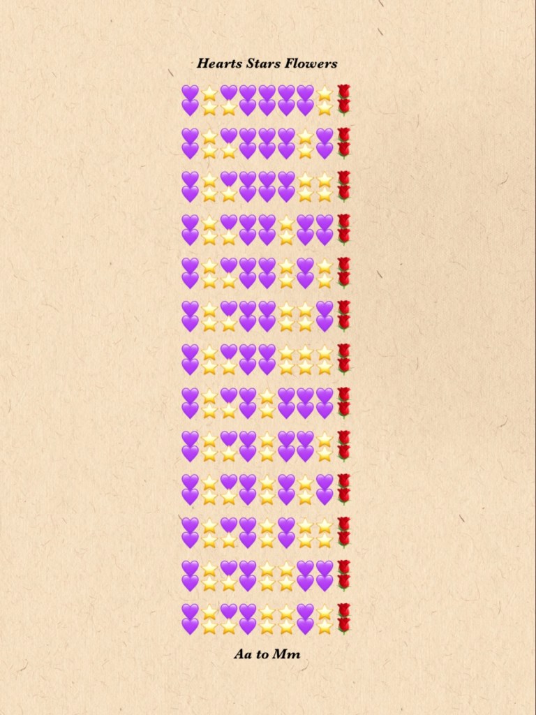 Hearts Stars Flowers January 9, 2026 / Flowerpoet Aa to Mm in my Valentine Alphabet Nn to Zz I had a bit of fun this morning changing simple binary to simple symbols Share this: Click to share on Facebook (Opens in new window) Facebook Click to share on Pinterest (Opens in new window) Pinterest Click to share on X (Opens in new window) X Click to email a link to a friend (Opens in new window) Email Click to print (Opens in new window) Print Like Loading... Related