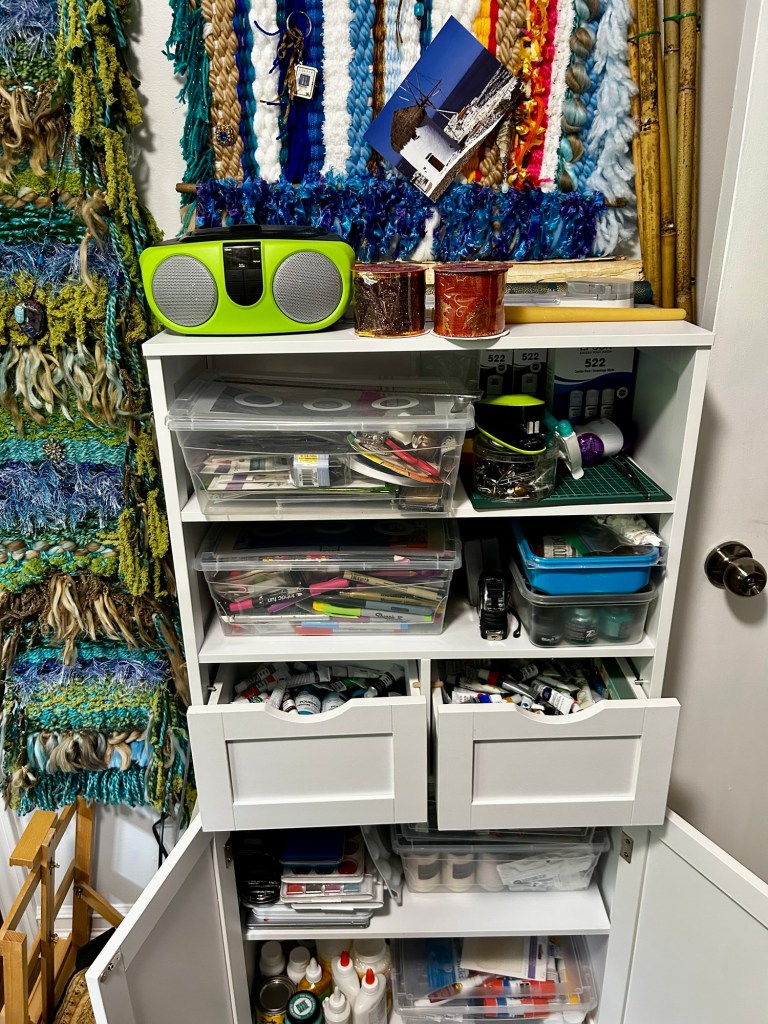 When I moved back to Ontario from BC a few months ago, my car was so packed I had to remove two large blank canvases from their frames and roll them up to squeeze them into a small space. The other day, I decided to start a new project so I unrolled them on our patio table to play outside with my acrylic paints. Messy and fun to do. One turned out to look like a tablecloth or shower curtain and the other looked overdone like a forgotten steak on the BBQ, neither destined for the Louvre, I know. However, it was my intention to create varying sized pieces of mosaics from the start. honestly 😂 Mosaic pieces are often a ‘go to’ when recycling some paintings I have done. My only ambition is fun. As you can see, I am only in the cutting phase of paint, cut, paste and display. I’ll probably add other surprise (to me) elements as I sometimes do. I’m in no hurry so will post more photos later perhaps.