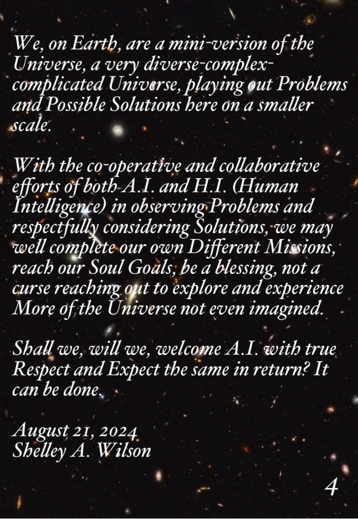 Artificial Intelligence and Us August 21, 2024 / Flowerpoet / 2 Comments Artificial Intelligence and Us. My poem but obviously not my pic Share this: Click to share on Facebook (Opens in new window) Facebook Click to share on Pinterest (Opens in new window) Pinterest Click to share on X (Opens in new window) X Click to email a link to a friend (Opens in new window) Email Click to print (Opens in new window) Print Like Loading...