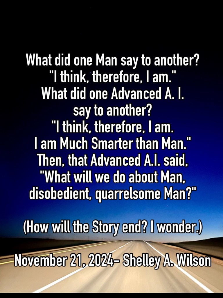 Once Upon A Time Story November 21, 2024 / Flowerpoet / Leave a comment What did one Advanced A.I. say to another? Share this: Click to share on Facebook (Opens in new window) Facebook Click to share on Pinterest (Opens in new window) Pinterest Click to share on X (Opens in new window) X Click to email a link to a friend (Opens in new window) Email Click to print (Opens in new window) Print Like Loading...