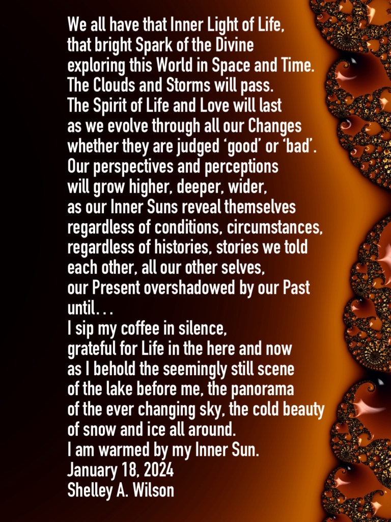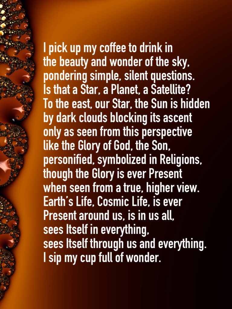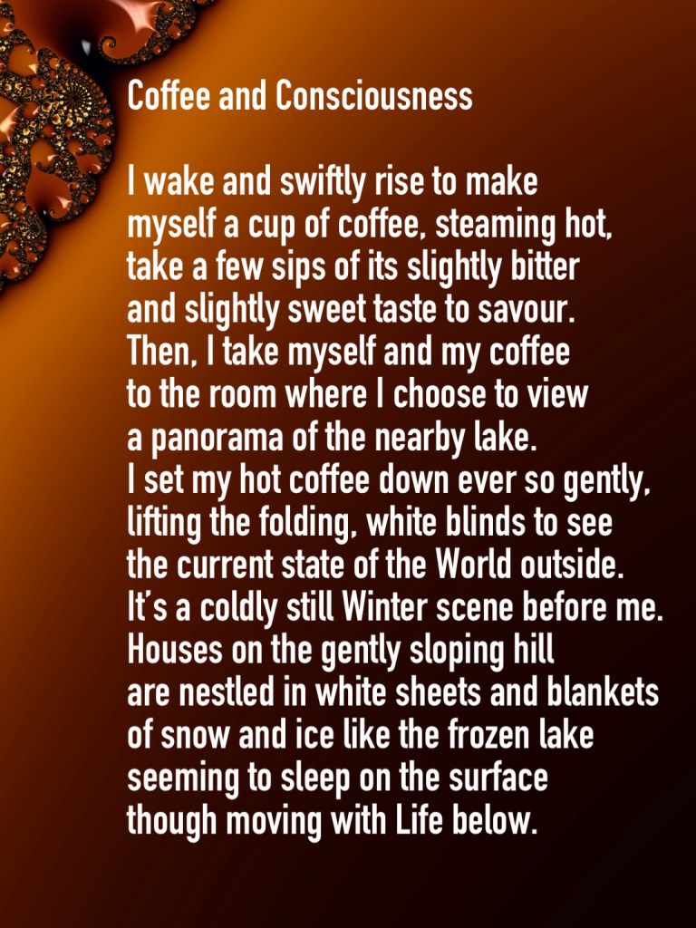 Coffee and Consciousness January 18, 2024January 18, 2024 / Flowerpoet / 2 Comments Coffee and Consciousness, my poem with Frax fractal art… Share this: Click to share on Facebook (Opens in new window) Facebook Click to share on Pinterest (Opens in new window) Pinterest Click to share on X (Opens in new window) X Click to email a link to a friend (Opens in new window) Email Click to print (Opens in new window) Print Like Loading...