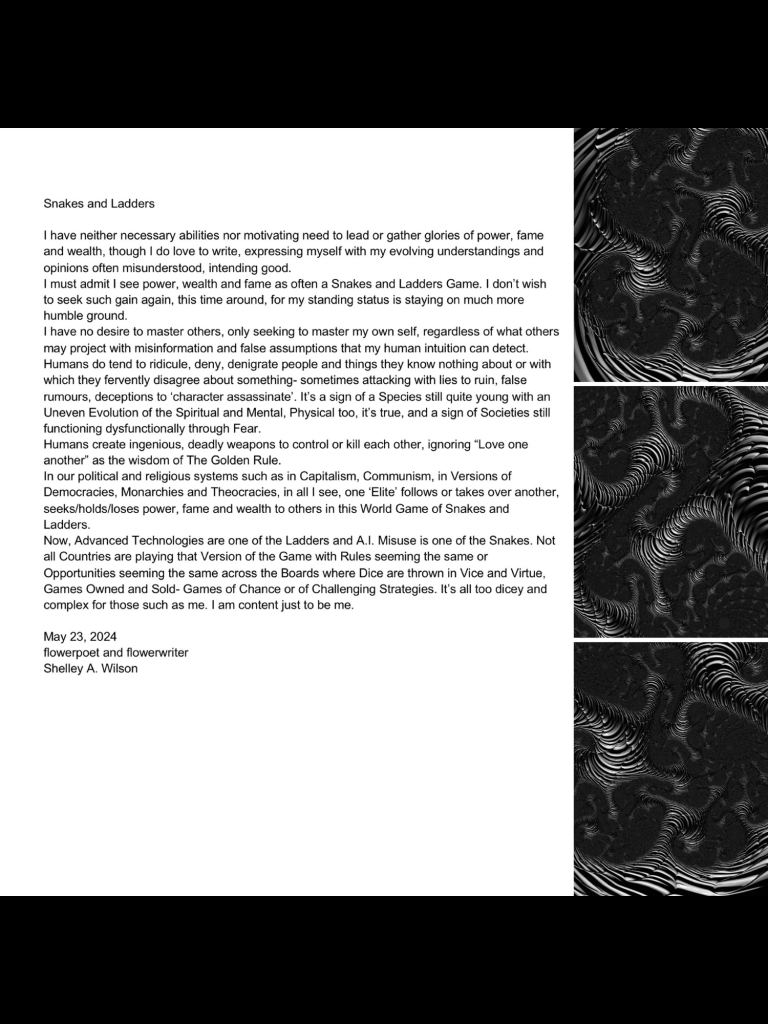 Snakes and Ladders May 23, 2024 / Flowerpoet / 2 Comments Now, Advanced Technologies are one of the Ladders and A.I. Misuse is one of the Snakes… Share this: Click to share on Facebook (Opens in new window) Facebook Click to share on Pinterest (Opens in new window) Pinterest Click to share on X (Opens in new window) X Click to email a link to a friend (Opens in new window) Email Click to print (Opens in new window) Print Like Loading...