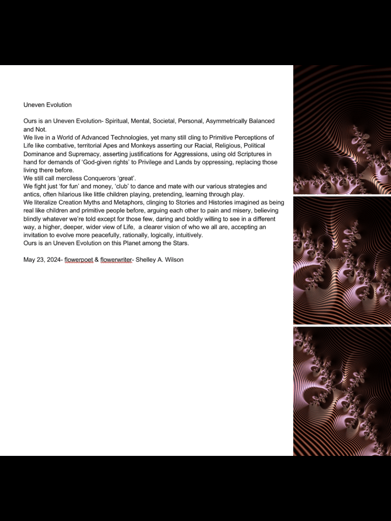 Uneven Evolution May 23, 2024 / Flowerpoet / Leave a comment Ours is an Uneven Evolution on this Planet among the Stars. Share this: Click to share on Facebook (Opens in new window) Facebook Click to share on Pinterest (Opens in new window) Pinterest Click to share on X (Opens in new window) X Click to email a link to a friend (Opens in new window) Email Click to print (Opens in new window) Print Like Loading...