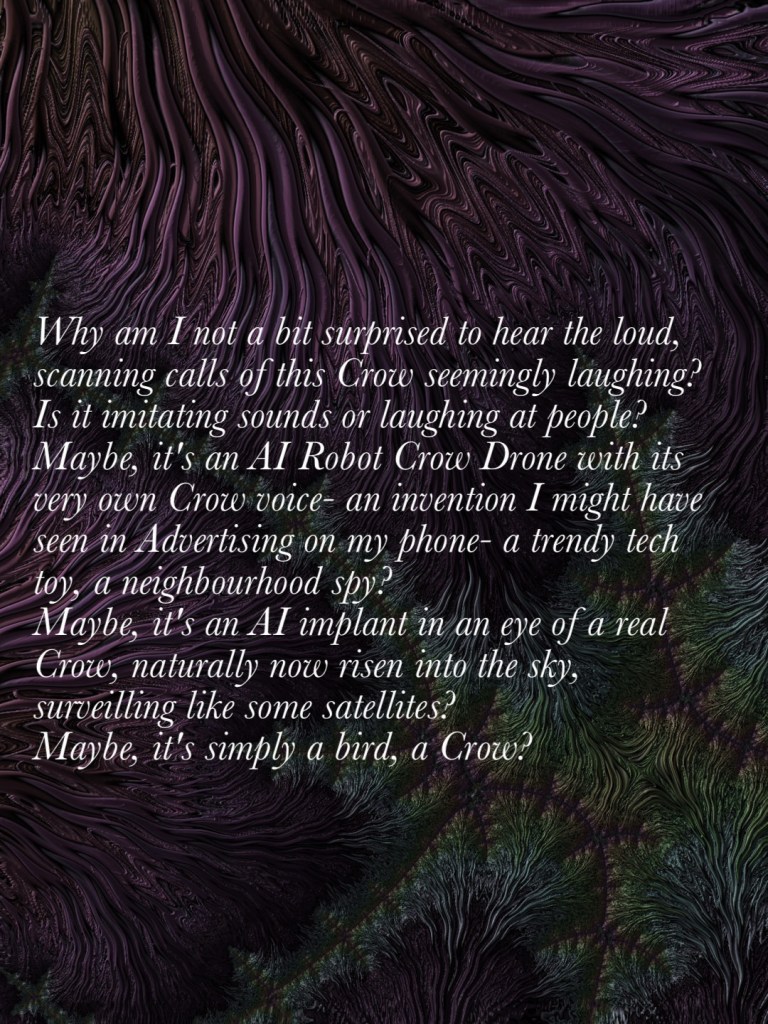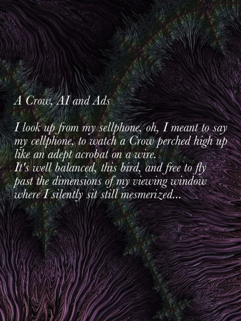 A Crow, AI and Ads April 5, 2025 / Flowerpoet / 4 Comments My poem on Frax captured fractal art images of creative AI Share this: Click to share on Facebook (Opens in new window) Facebook Click to share on Pinterest (Opens in new window) Pinterest Click to share on X (Opens in new window) X Click to email a link to a friend (Opens in new window) Email Click to print (Opens in new window) Print Like Loading...