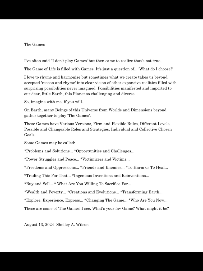 The Games August 13, 2024 / Flowerpoet / Leave a comment The Game of Life is filled with Games. Share this: Click to share on Facebook (Opens in new window) Facebook Click to share on Pinterest (Opens in new window) Pinterest Click to share on X (Opens in new window) X Click to email a link to a friend (Opens in new window) Email Click to print (Opens in new window) Print Like Loading...