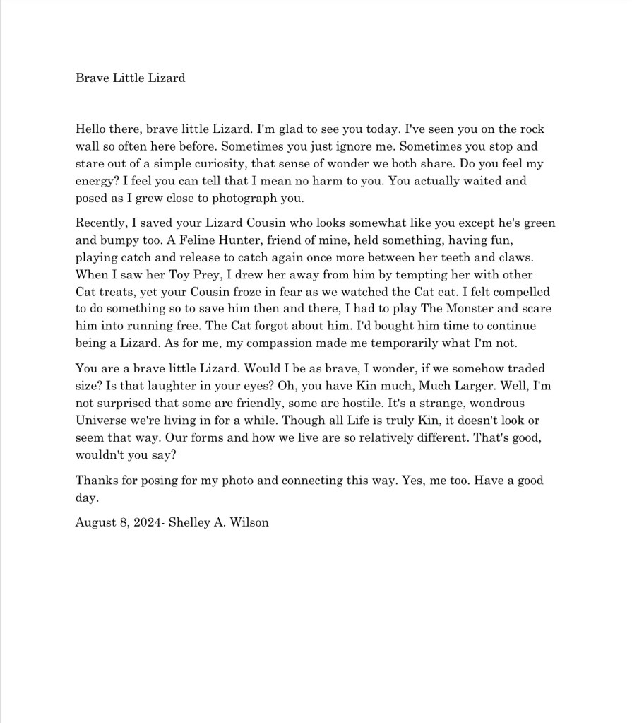 Brave Little Lizard August 8, 2024 / Flowerpoet / 2 Comments My photo and prosepoem… Brave Little Lizard Share this: Click to share on Facebook (Opens in new window) Facebook Click to share on Pinterest (Opens in new window) Pinterest Click to share on X (Opens in new window) X Click to email a link to a friend (Opens in new window) Email Click to print (Opens in new window) Print Like Loading...