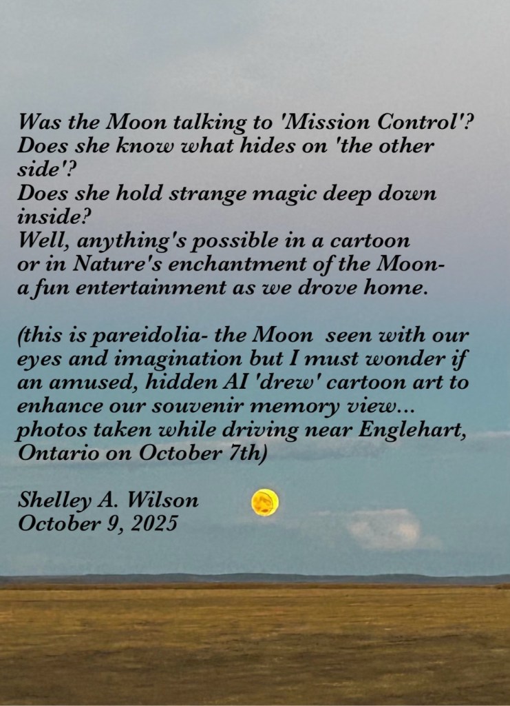 Cartoon Moon October 9, 2025 / Flowerpoet / Leave a comment I saw Nature enjoy some fun last night… Though the Fall sky became dim by 7 p.m… Then, my Daughter laughed with delight… fast photos taken while we were driving… on our way home over the bridge… Share this: Click to share on Facebook (Opens in new window) Facebook Click to share on Pinterest (Opens in new window) Pinterest Click to share on X (Opens in new window) X Click to email a link to a friend (Opens in new window) Email Click to print (Opens in new window) Print Like Loading...