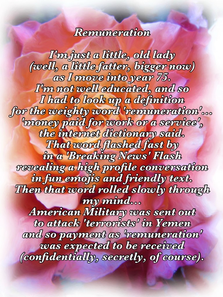 Remuneration March 26, 2025 / Flowerpoet / Leave a comment Remuneration-‘money paid for work or service’… Share this: Click to share on Facebook (Opens in new window) Facebook Click to share on Pinterest (Opens in new window) Pinterest Click to share on X (Opens in new window) X Click to email a link to a friend (Opens in new window) Email Click to print (Opens in new window) Print Like Loading...