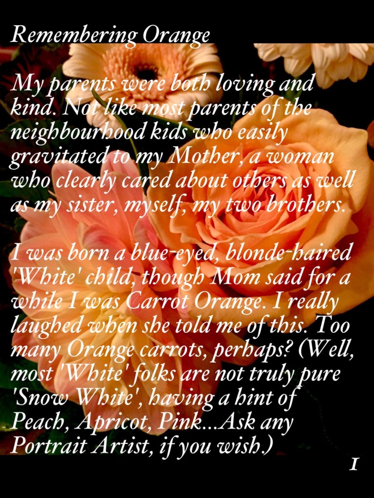 Remembering Orange August 18, 2024 / Flowerpoet / Leave a comment The Colour Orange Share this: Click to share on Facebook (Opens in new window) Facebook Click to share on Pinterest (Opens in new window) Pinterest Click to share on X (Opens in new window) X Click to email a link to a friend (Opens in new window) Email Click to print (Opens in new window) Print Like Loading...