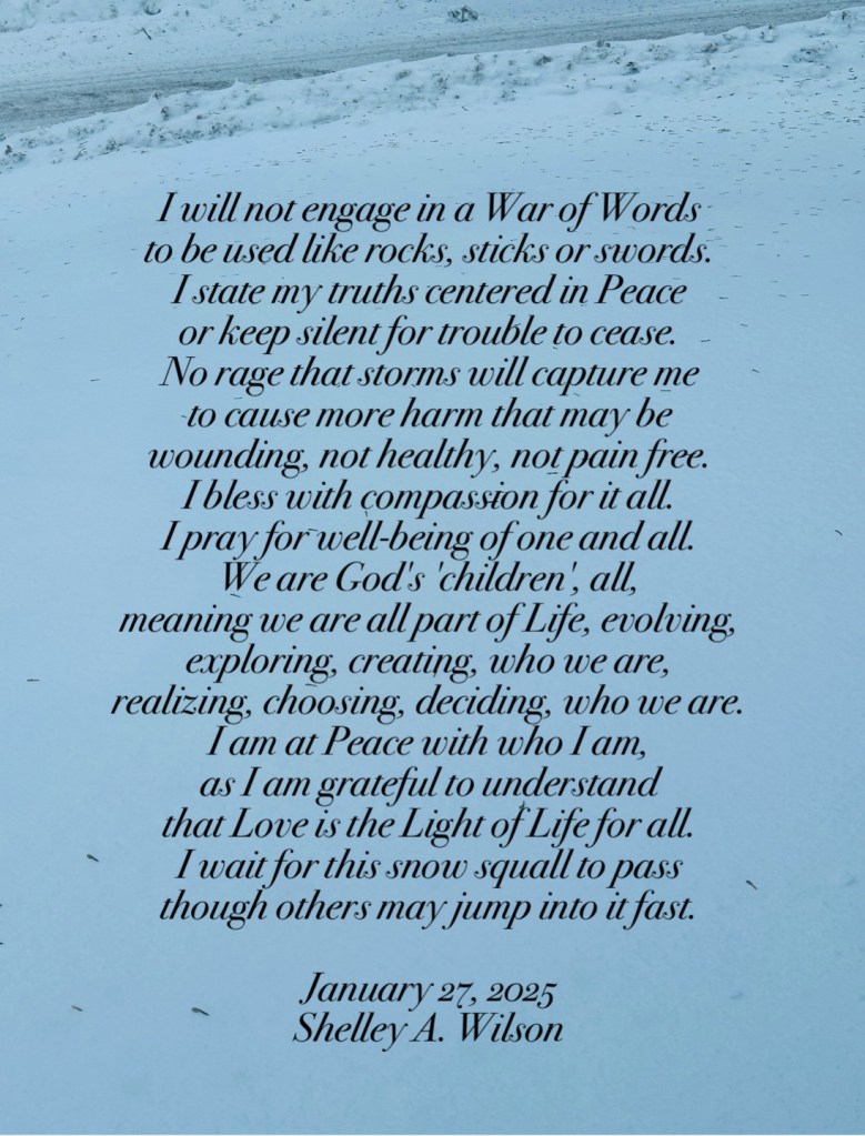 Snow Squall January 27, 2025 / Flowerpoet / Leave a comment I wait for this snow squall to pass… Share this: Click to share on Facebook (Opens in new window) Facebook Click to share on Pinterest (Opens in new window) Pinterest Click to share on X (Opens in new window) X Click to email a link to a friend (Opens in new window) Email Click to print (Opens in new window) Print Like Loading...
