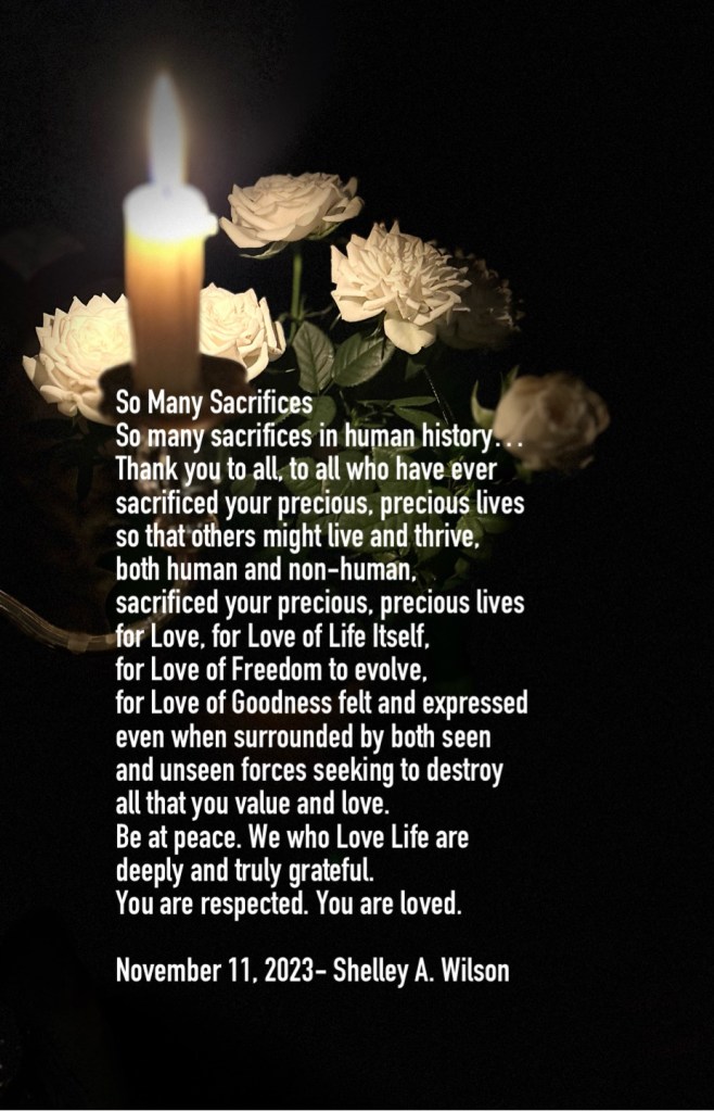 Lest We Forget Again November 5, 2025 / Flowerpoet / Leave a comment …our slow, uneven evolutions… …the ideas, the beliefs, perceptions of ‘Need’… …the ‘glory’ seen by some as being ‘great’ but Not… Seen by the Light of Life’s Spirit… Remembrance Day, November 11th. Share this: Click to share on Facebook (Opens in new window) Facebook Click to share on Pinterest (Opens in new window) Pinterest Click to share on X (Opens in new window) X Click to email a link to a friend (Opens in new window) Email Click to print (Opens in new window) Print Like Loading...