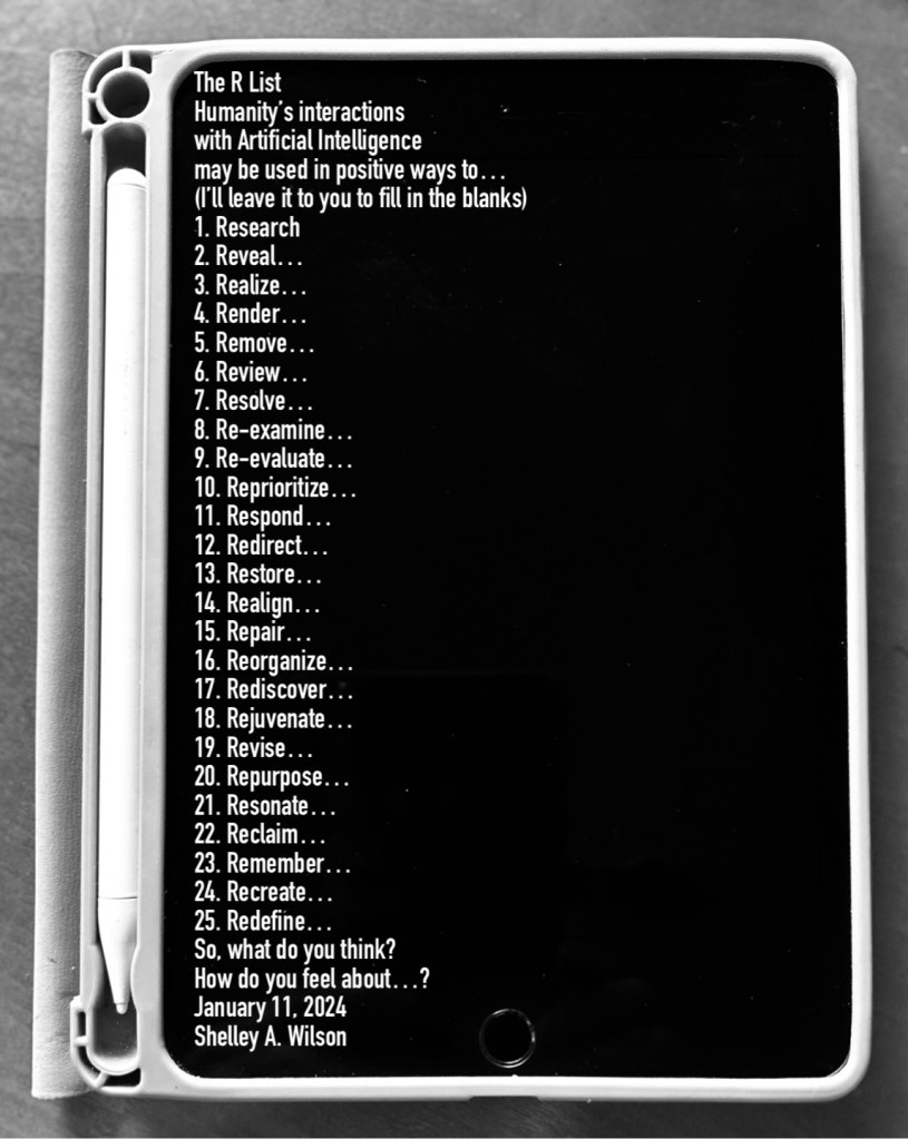 The R List January 11, 2024 / Flowerpoet / 2 Comments Humanity’s interactions with Artificial Intelligence may be used in positive ways to… ( my photo and list) Share this: Click to share on Facebook (Opens in new window) Facebook Click to share on Pinterest (Opens in new window) Pinterest Click to share on X (Opens in new window) X Click to email a link to a friend (Opens in new window) Email Click to print (Opens in new window) Print Like Loading...