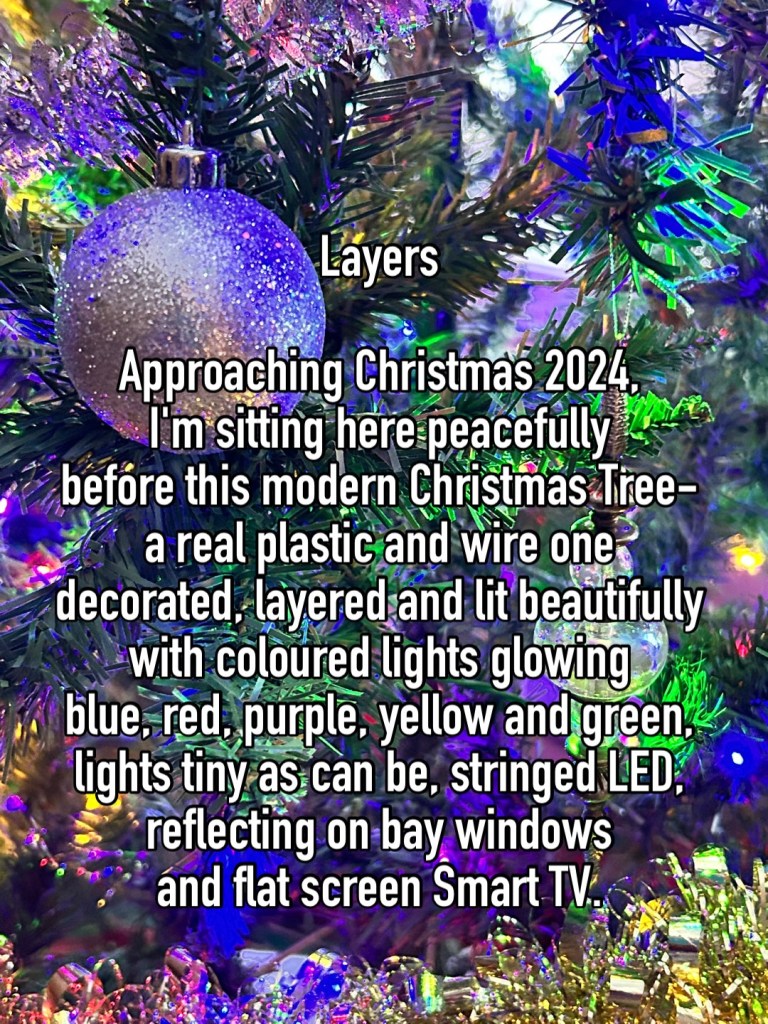 By the lake this morning… a gloomy viewCheery lights inside… my son and I decorated his house for the holidays. Even simple decorations somehow become magical in the glow of colourful lights. The tree and star change slowly… as a child I would have been fascinated by this ‘magical’ transformation. Even as an adult, the coloured light is mesmerizing…My son, Aaron, was gifted a great Christmas stocking. Many of the ornaments on the tree were handmade over time by my daughter, Alissa. From a greenish glow to white…From white to coloured light… I turn off the other lights and just watch the cheery ‘show’…