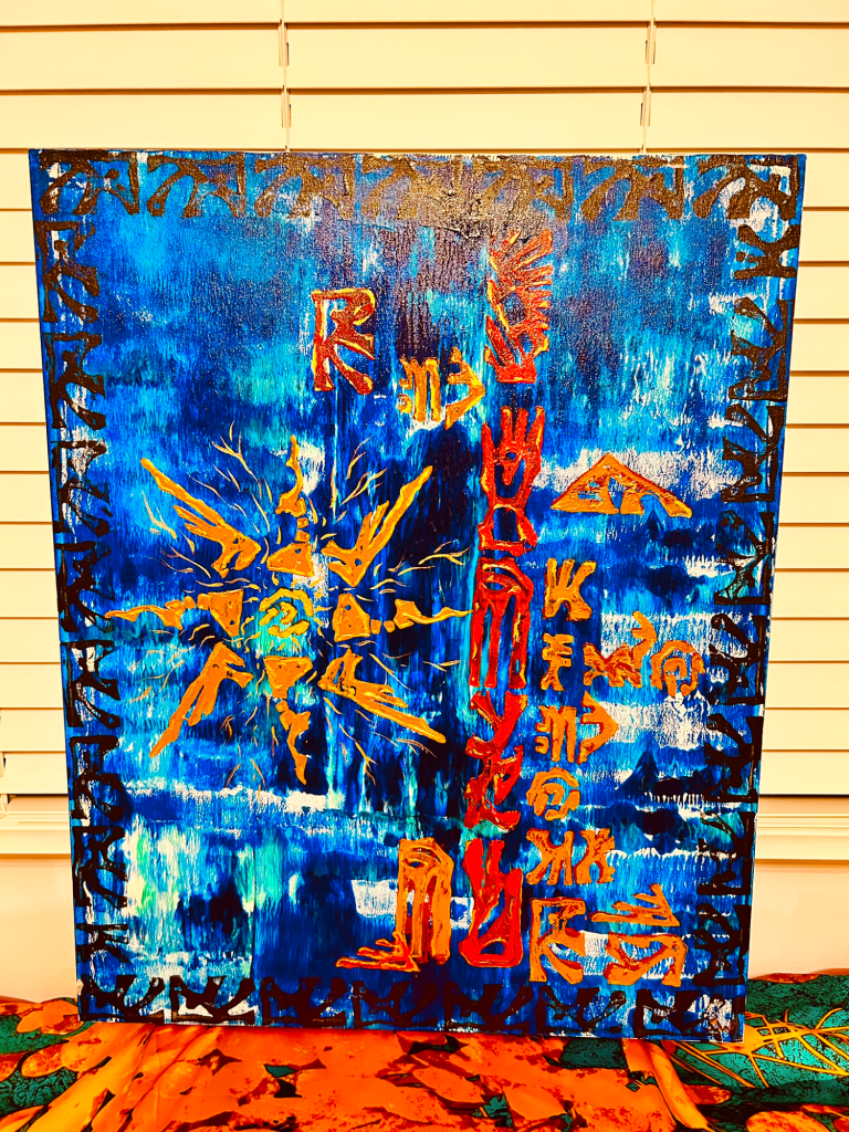 This is another painting I did a while back. My previous photos of it didn’t show the intensity of the colours. Even now, I had to edit the lighting on my cell phone camera to get it right at last. The changing light of the day also changes the colours and their effects. I can see why the great painters and other artists become so fascinated by the impact of lighting. I’m still learning and having fun with it as my hobby, like my poetry.