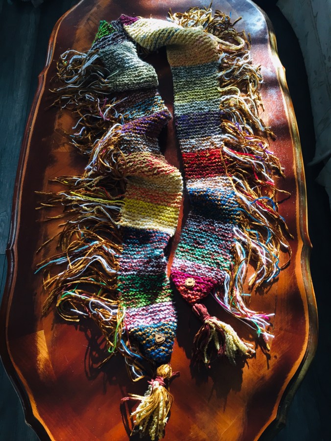 This is another ‘Art Scarf’ I created with just plain knitting and inexpensive yarns. Perhaps I’ll add a simple crochet leaf or flower to it. Or not. This scarf has an ‘organic’ look to me:)