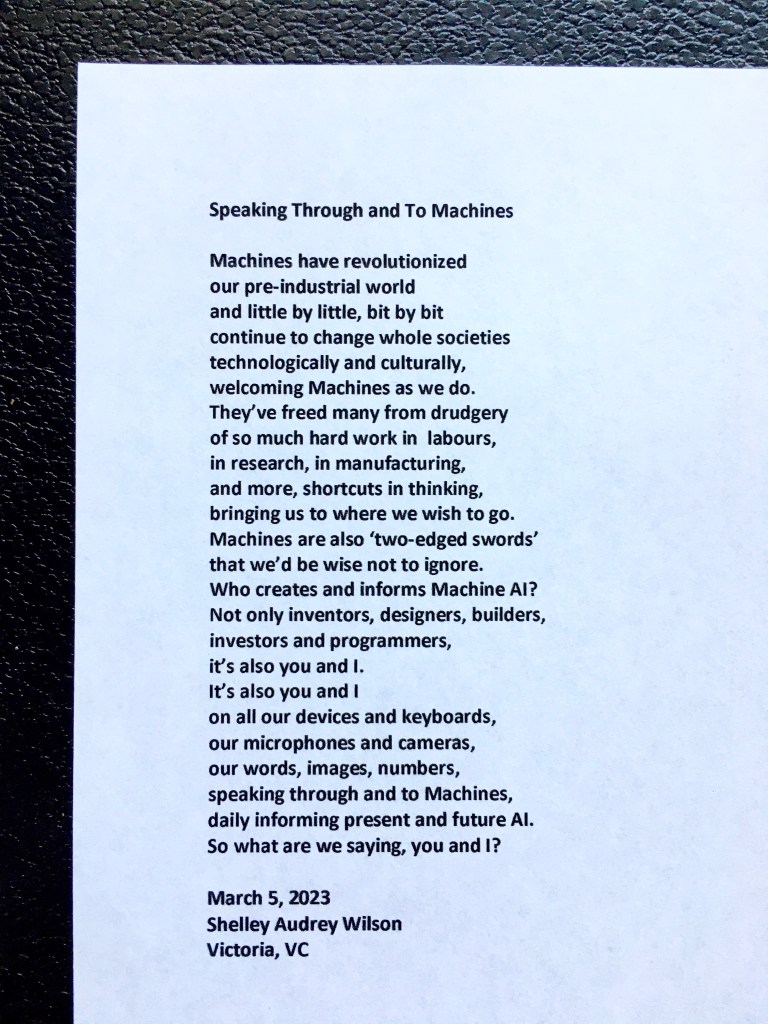 Machines In Three March 5, 2023 / Flowerpoet / Leave a comment This morning’s photo on a visit to the old neighbourhood. I wrote a poem this morning and updated two others related to the Machine Theme. Share this: Click to share on Facebook (Opens in new window) Facebook Click to share on Pinterest (Opens in new window) Pinterest Click to share on X (Opens in new window) X Click to email a link to a friend (Opens in new window) Email Click to print (Opens in new window) Print Like Loading...