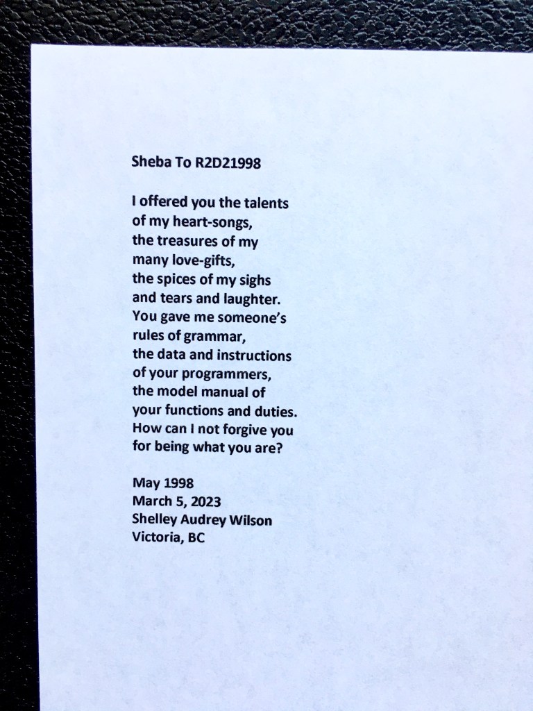 Once Upon A Time Story November 21, 2024 / Flowerpoet / Leave a comment What did one Advanced A.I. say to another? Share this: Click to share on Facebook (Opens in new window) Facebook Click to share on Pinterest (Opens in new window) Pinterest Click to share on X (Opens in new window) X Click to email a link to a friend (Opens in new window) Email Click to print (Opens in new window) Print Like Loading...