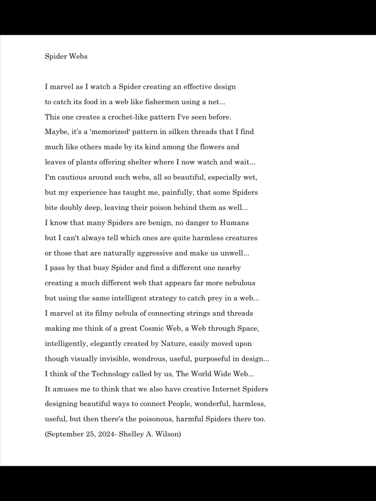 Spider Webs September 25, 2024 / Flowerpoet / Leave a comment My photo and poem Spider Webs Share this: Click to share on Facebook (Opens in new window) Facebook Click to share on Pinterest (Opens in new window) Pinterest Click to share on X (Opens in new window) X Click to email a link to a friend (Opens in new window) Email Click to print (Opens in new window) Print Like Loading...