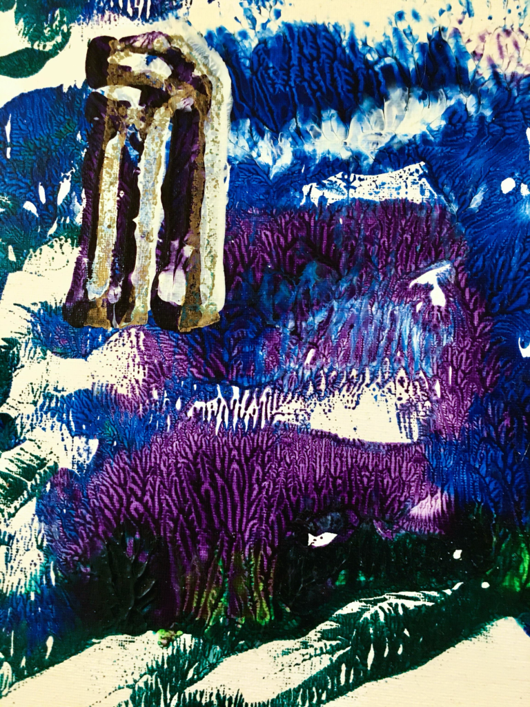 This is my reworked acrylic painting with added leaves and shells resting for a few minutes here beside my weaving. Until recently, it was hidden behind my yarn bins asking to be reworked. It will have to sit on top of a book shelf as our place is small. ‘Cozy’, I mean lol!
