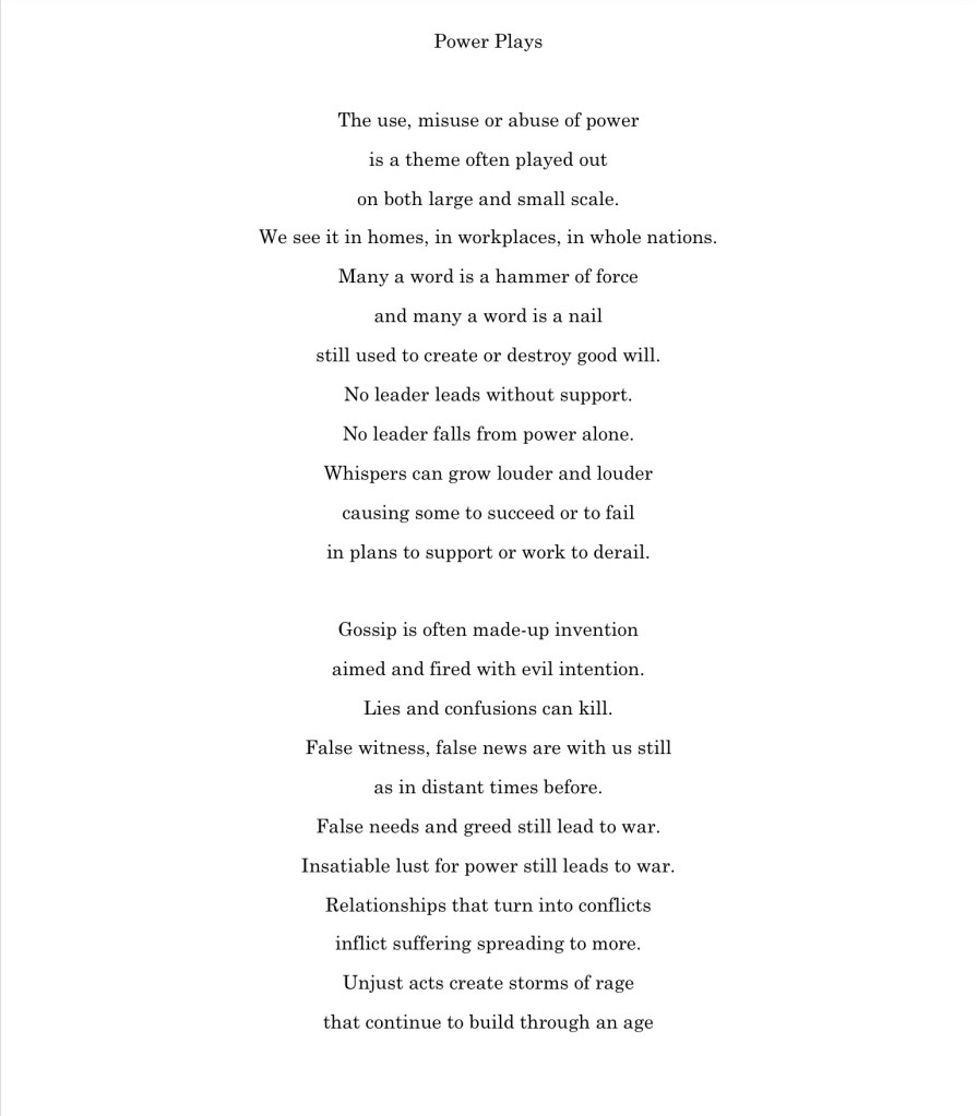 Power Plays… January 10, 2025 / Flowerpoet / 3 Comments My poem in text only… Share this: Click to share on Facebook (Opens in new window) Facebook Click to share on Pinterest (Opens in new window) Pinterest Click to share on X (Opens in new window) X Click to email a link to a friend (Opens in new window) Email Click to print (Opens in new window) Print Like Loading...