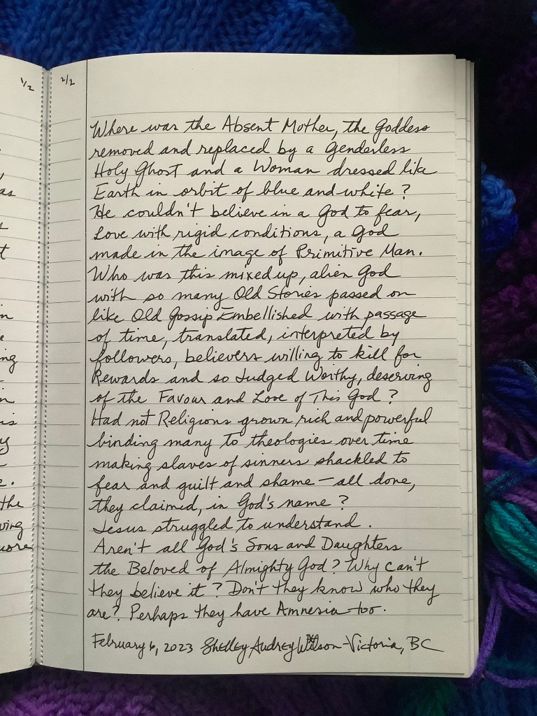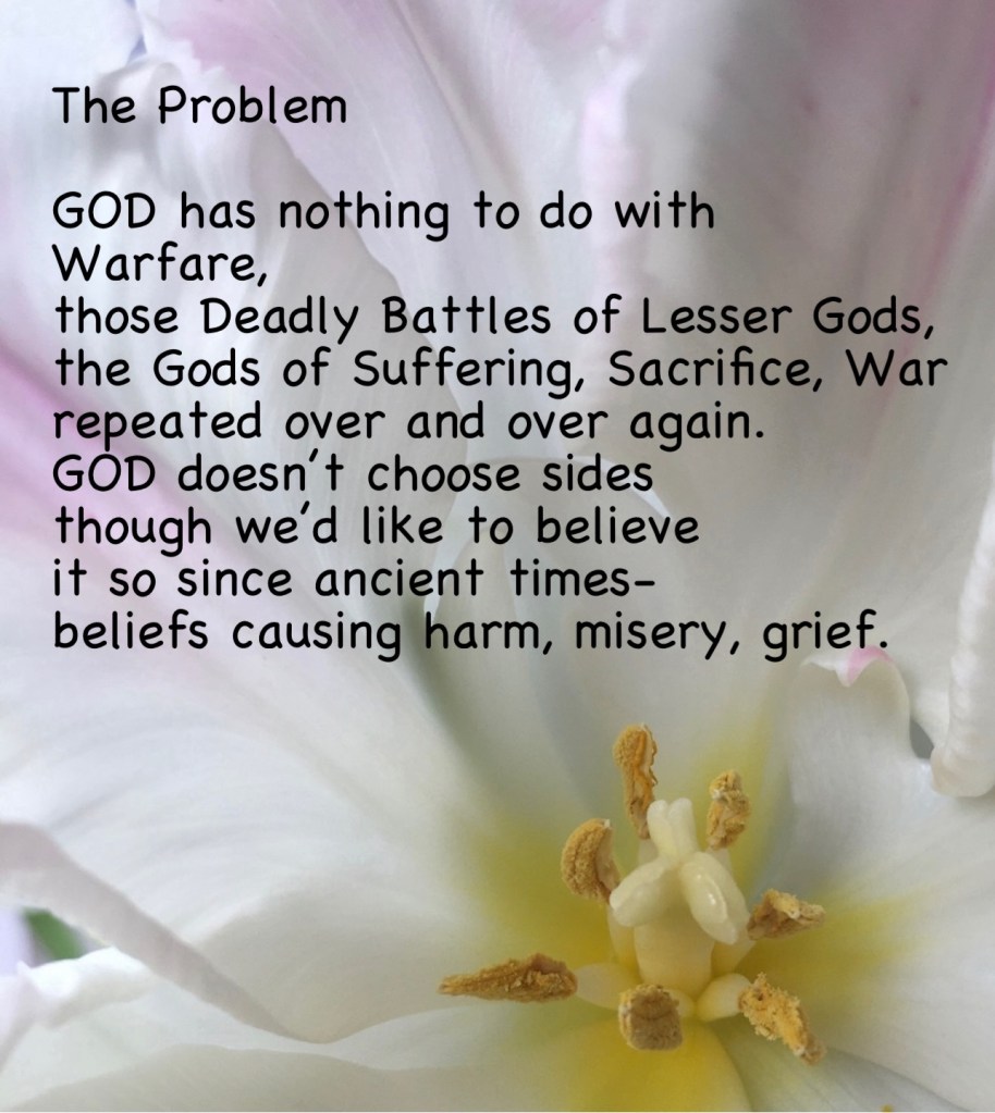 I once believed in a God of Contradictions, a Parent Almighty, a Loving Creator God of Unlimited Power who was Powerless to Make Humans Obey, especially Women, a God who Needed the Help of Men to Fight Ancient and Modern Wars, to Obey and Kill on Command, Obedient to Commandments and Punishing Laws, a God of Wrath.