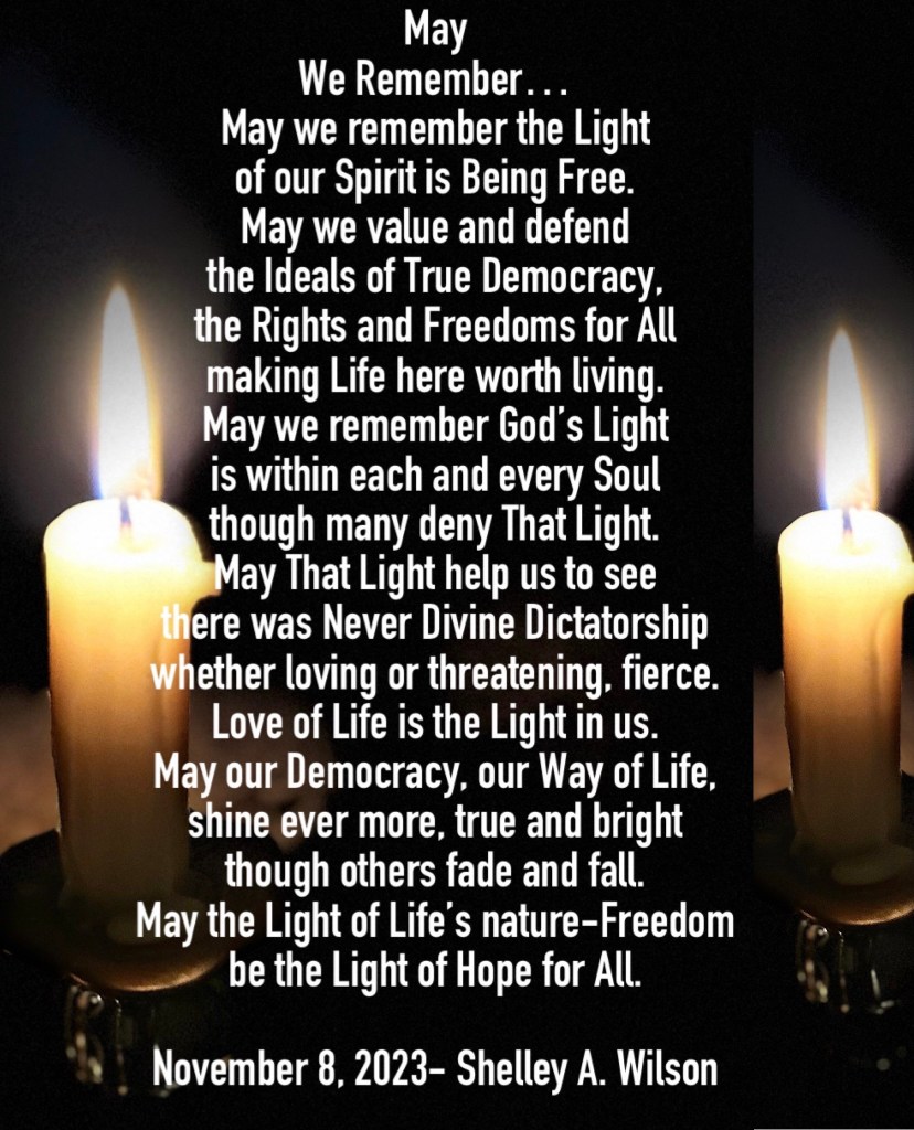 Lest We Forget Again November 5, 2025 / Flowerpoet / Leave a comment …our slow, uneven evolutions… …the ideas, the beliefs, perceptions of ‘Need’… …the ‘glory’ seen by some as being ‘great’ but Not… Seen by the Light of Life’s Spirit… Remembrance Day, November 11th. Share this: Click to share on Facebook (Opens in new window) Facebook Click to share on Pinterest (Opens in new window) Pinterest Click to share on X (Opens in new window) X Click to email a link to a friend (Opens in new window) Email Click to print (Opens in new window) Print Like Loading...